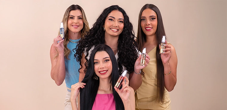 Cabelos profundamente hidratados, alinhados, nutridos, perfumados, com brilho espelhado e toque sedoso.